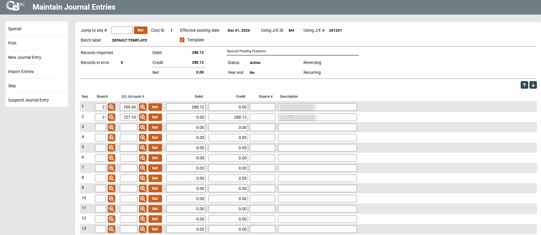 On each line enter a branch number, G/L account number, debit or credit amount, source notation (optional) and description. Each line is automatically assigned a sequential number.
