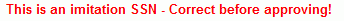 When this record is worked prior to membership creation, the valid SSN can be entered. The duplicate SSNs are generated with the next available number in the range 993-00-000 to 993-00-999. If no number in this range the record will appear on the Exception report. This will be designated with a warning message next to the SSN field, as shown below:
