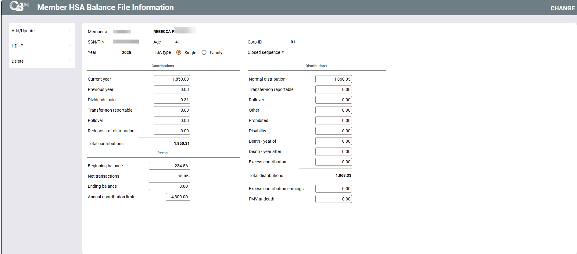 This screen shows totals for all of the deposit and withdrawal activity, separated by HSA Code. When in “CHANGE” mode for updating balance file amounts, using Enter will automatically recalculate all screen totals so you can quickly see if the figures entered add up properly. When done, you must use Add/Update to save all of the changes made. (One confirmation message will appear.)
