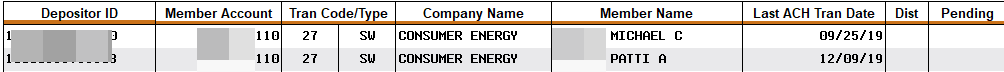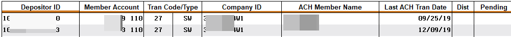 Notice the Last ACH Tran Date column showing the date of the last ACH transaction for each record. This is especially helpful if you are attempting to “clean up” old depositor information where transactions have not occurred for some time.