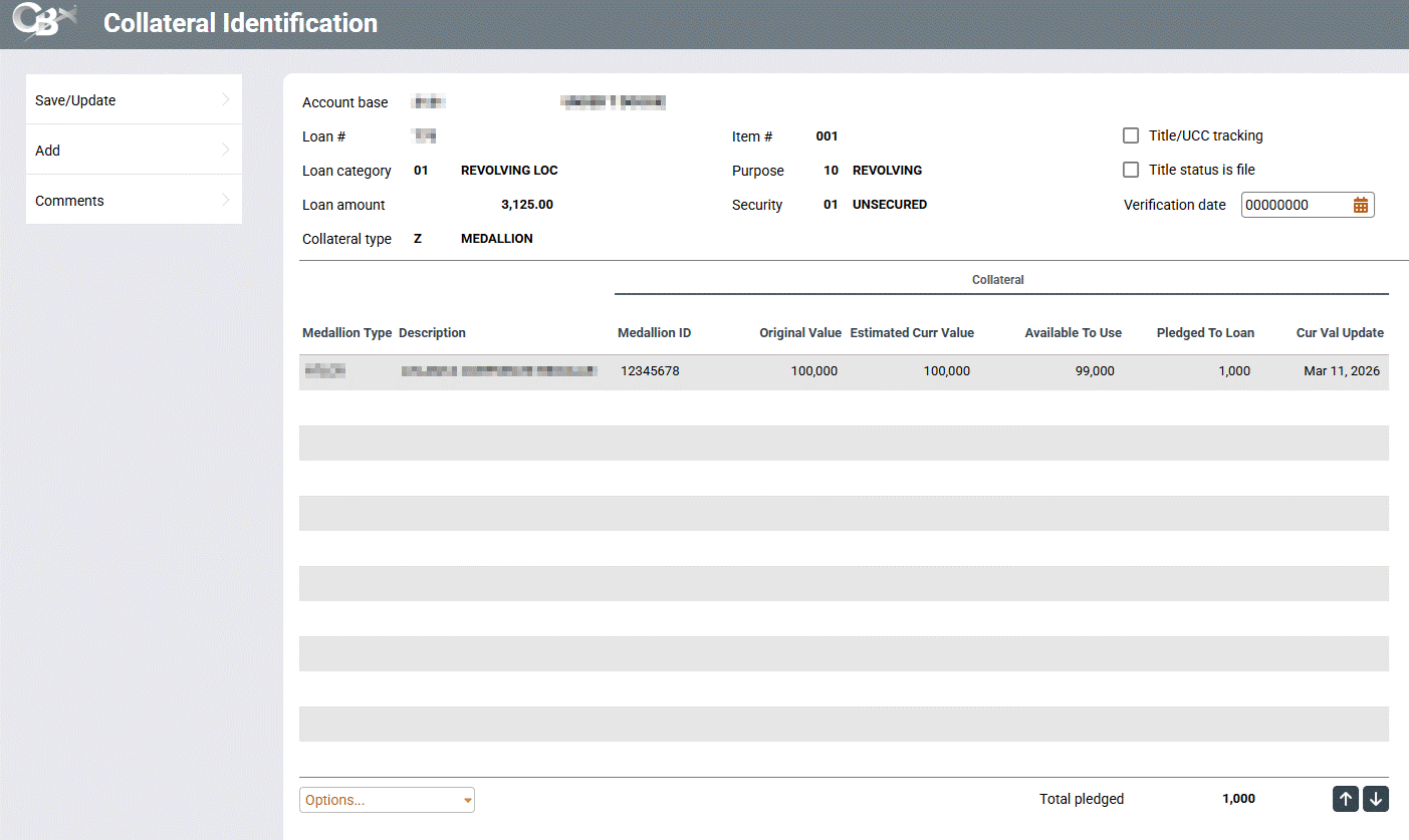 Access this screen by selectinga Medallion Type collateral from theprevious screenand using the Select option.