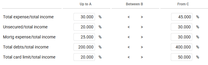 For each of the debt-to-income ratios listed, enter a number using three digits past the decimal. Any ratios at this number or higher will receive an “C” rating. |