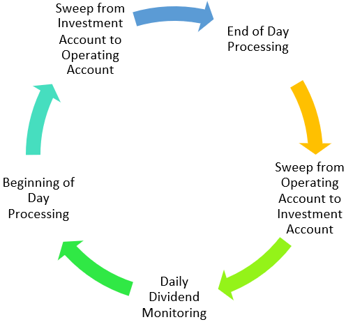 In a nutshell, at the end of each processing day before interest is accrued, funds transfer from the operating account to the investment account. At the beginning of the next day, funds transfer (sweep) back to the operating account. The relationship can be configured to sweep all funds or any funds over a specified balance to the investment account. After interest accrual and end-of-day balances have been calculated, all funds, no funds or a fixed amount of funds transfer back to the operating account. After the transactions and fees are posted, two exception reports are posted if transfers to not occur. These reports are only generated if the exception occurs. Find the report samples on this topic.