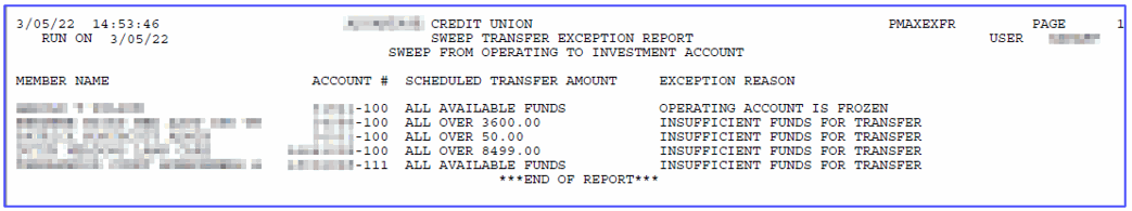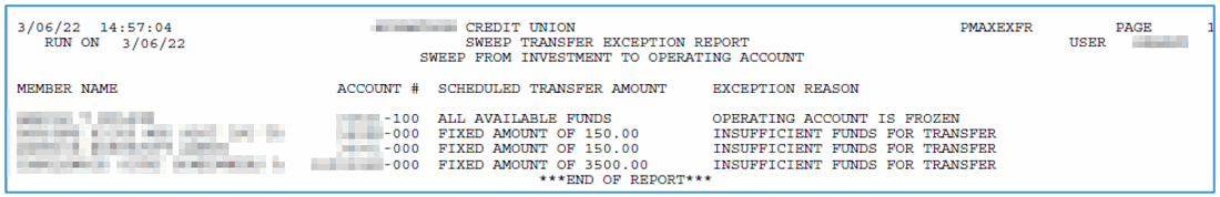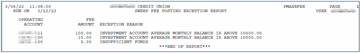 These transactions are posted daily. At that time two exception reports are generated if sweeps do not occur, one for operating to investment account and one for investment to operating account. These are only generated if there is an exception. Fees are posted on the second day of the month and at that time an exception report is posted for fees that are not charged. Fees are taken from the Operating account and will not take the account negative. In the case that funds are not available to cover the fee, a partial fee will be taken.