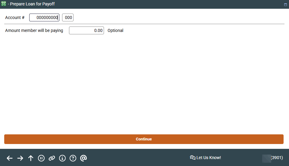 Enter the loan account number and suffix. The amount member will be paying can be entered here but is not required. If you leave it blank, the system will calculate the payoff amount for you.