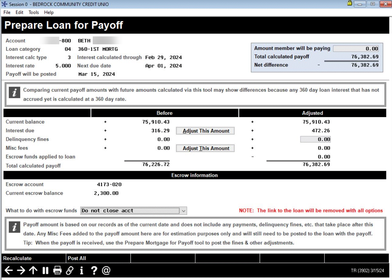 In this example, interest was calculated and has accrued through Feb. 29th (day to calculate interest on the loan category is 31, or last day of the month). The loan is prepped for payoff on March 15th, so the member owes a partial month of interest. The number of days between Feb 29th and March 15th is 15 days, therefore 15 days of interest is calculated at the appropriate per diem based on 365 Interest Calc (15 days at 10.398) and added to the payoff interest.