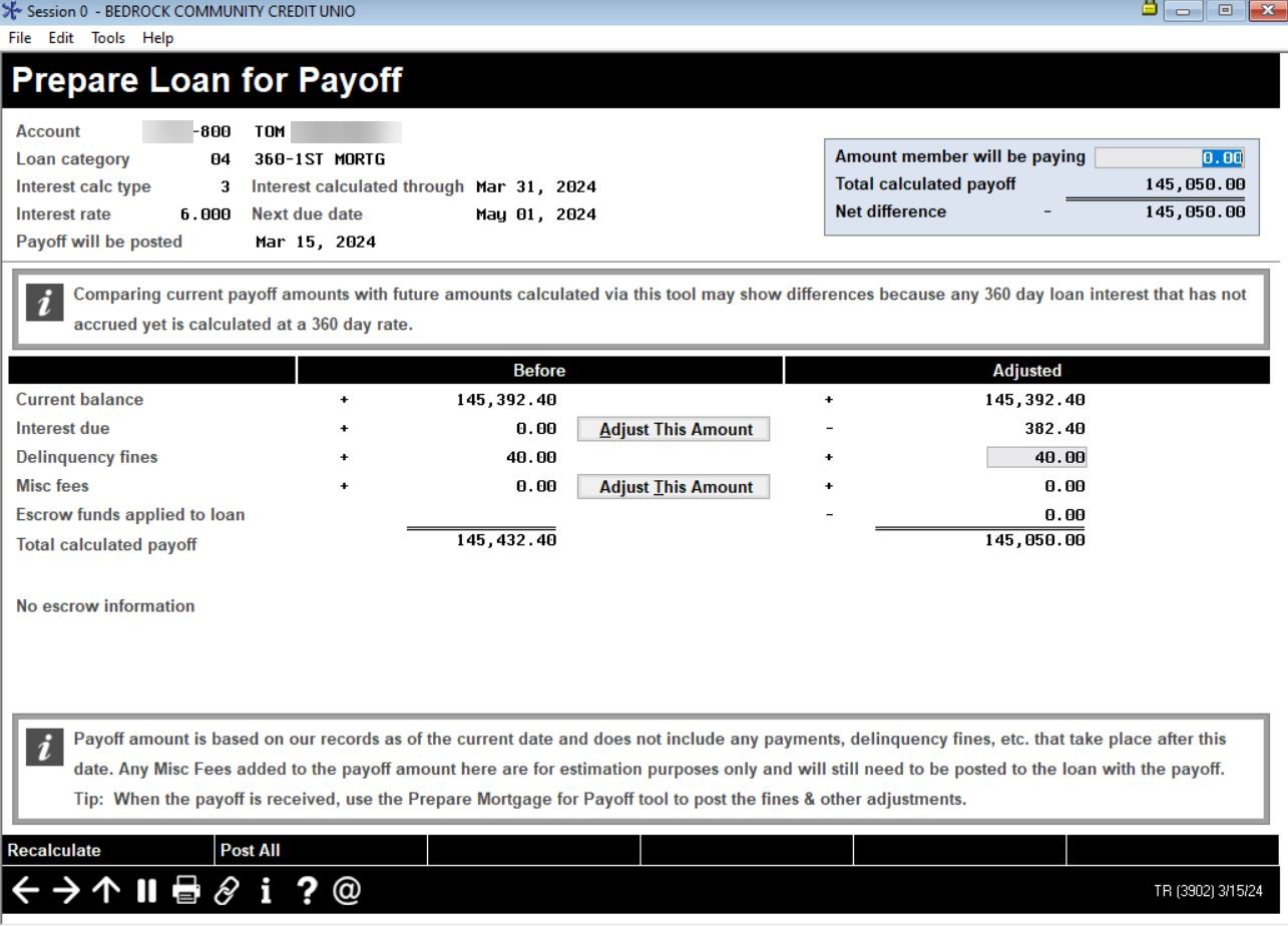 Remember that you must use Enter, then F5-Save to return to the main screen and apply the adjusted interest amount to the Total Calculated Payoff.