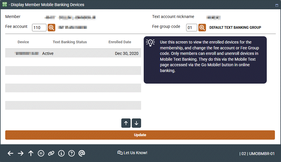 From this screen, the employee can view the enrolled devices for the membership, and change the fee account or Fee Group code. (Only members can enroll and unenroll devices in Mobile Text Banking.)