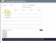 This second screen follows the first screen and shows all of the member's accounts and lists any overdraft protection accounts that have already been assigned. (If you are accessing this screen as part of opening a new checking account, the account you just opened will be highlighted.)