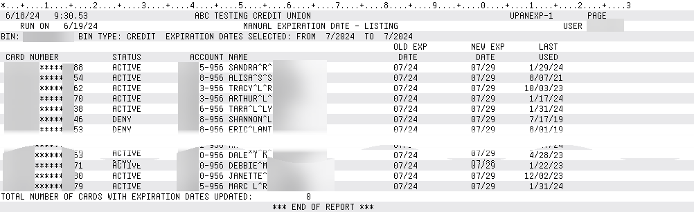 To print a report of the cards prior to updating, use the Print (F14) button to print a Listing report of the UPANEXP-1 report, seen below. Note that after the update is complete, another report labeled Manual Expiration Date - Update is generated listing all cards updated, as well as any errors.