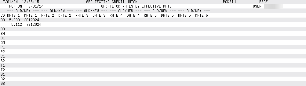 The following report is generated automatically whenever Save/Update (F20) is used in the certificate rate maintenance screens. It will also be generated every day during daily processing. If a rate change was actually put into effect, it will be shown on the report; otherwise, it will be blank to indicate that rates were monitored but no changes were scheduled.