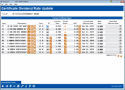 Use this column to enter a new rate for any certificate product. Be sure to also enter a date into the New Rate Effective Date column and use F20-Save/Update to record the change. |