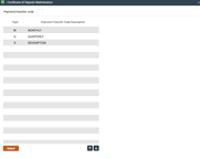 This screen appears when you choose Payment/Transfer Codes on the initial Certificate Product Configuration screen.