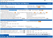 Access this screen by selecting an account service charge from the listing on the Account Service Charge Programs screen and then "Fee Waivers and Settings." This screen appears also appears after adding criteria to the program settings screen when adding a service charge.