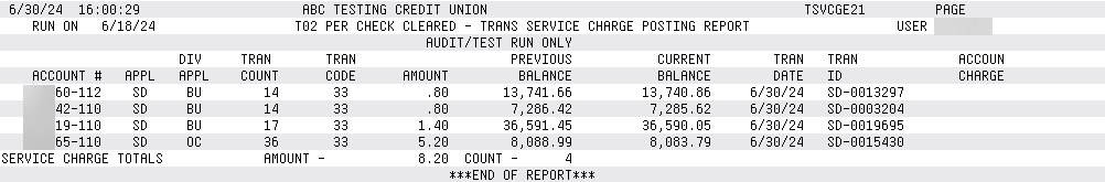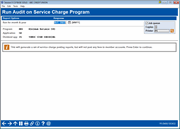 This screen allows you to run and audit of your service charge. This screen also allows you to evaluate the charges and waivers prior to activating the service charge.