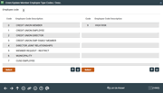 This is the first of two screens used to configure codes that can be used to mark certain memberships as insiders—accounts that belong to your employees, Board members or other volunteers, relatives of credit union employees, etc.