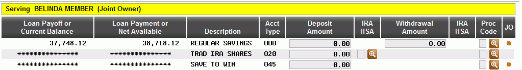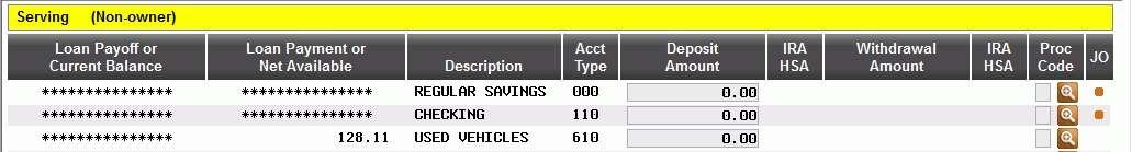 If you use Currently Serving and the person you are assisting is a joint owner or additional signer on the account, then on the Main Teller Posting screen a yellow bar will appear above the sub account listing indicating that you are serving a member other than the primary member: