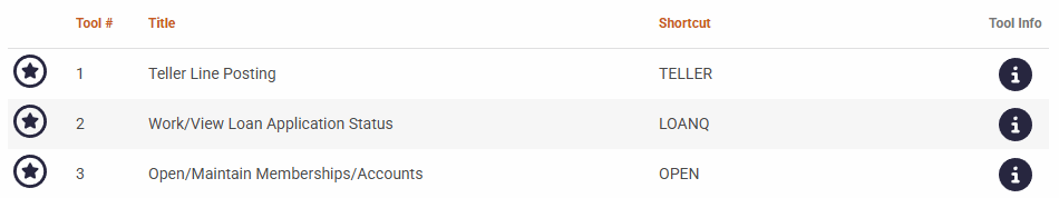 Interested in learning about tools related to your position at the credit union? Click this to see the tool set that presents you with tools you may wish to investigate based on your job description. Must be configured by your security officer in your Employee Profile. |