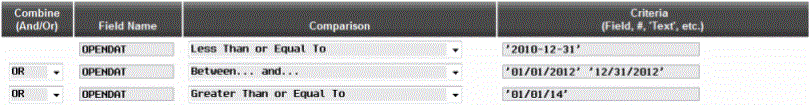 When using ISO dates, the date must be entered in single quotations (like a text field). Criteria can be entered with different formats, including with or without leading zeros (with the exception of MM/DD/YY), but they must be in single quotes. You can simply enter your date range or use the greater/less than comparisons to find all records between, after, or before the defined dates. In the example below, we are selecting accounts opened Dec 31, 2010 or earlier, between Jan 1 and Dec 31, 2012, or since Jan 1, 2014.