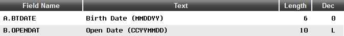 With the File Expansion Project in 2014, CU*Answers began reformatting date fields into an easier to use ISO format. In the example below, BTDATE (from MASTER) is an old date, whereas OPENDAT (from MEMBER1) is in the new format. ISO-formatted dates are always 10 digits in length and are a special date format, identified by the 'L' in the Decimal column. As you can see, ISO formatted dates are already formatted to show a more easy to read date (YYYY-MM-DD) versus the old format that is displayed as a numerical value requiring formatting. Each format has different ways in which it can be used to create custom fields. See the next section to see some examples.