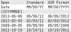 In the following example, two new fields were created from the OPENDAT field. DATE(field_name) creates a standard MM/DD/YY formatted date field. CHAR(field_name,USA) creates a text field in the MM/DD/YYYY format. The result below shows the three fields, all with the same information, but different presentations side-by-side.